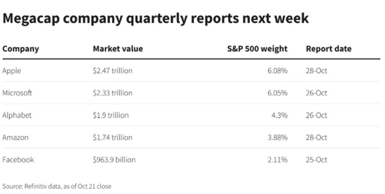 苹果、微软、谷歌母公司Alphabet、亚马逊公司和Facebook都将于近期公布财报。这五家公司合计占标普500指数22%以上的权重,它们的股票走势对整体指数有着巨大的影响。