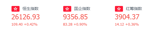 截至上周五收盘,恒生指数涨109.4点或0.42%,报26126.93点,国企指数涨0.9%,报9356.85点,红筹指数涨0.36%,报3904.37点。