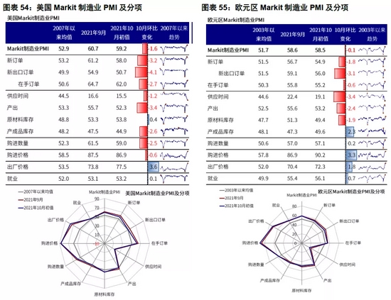 欧洲方面,10月Markit制造业及服务业PMI较前月均回落。欧元区10月Markit制造业PMI初值58.5,略低于前值但高于预期。分项来看,新订单、产出回落明显,供应交付时间显著拉长,购进价格抬升明显。与此同时,受疫情扰动影响,欧元区10月Markit服务业PMI初值回落至54.7,低于前值(56.4)和预期(55.4),为今年4月以来最低。分国家看,欧元区最大经济体德国制造业(58.2)和服务业PMI(52.4)较前月均回落,服务业回落更为明显;法国制造业PMI(53.5)回落,服务业PMI抬升(56.6)。