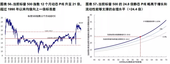 当前标普500指数24.8倍静态P/E略高于增长(10月Markit 制造业PMI=59.2)和流动性(10年美债利率1.63%)能够支撑的合理水平(~24.4倍)。