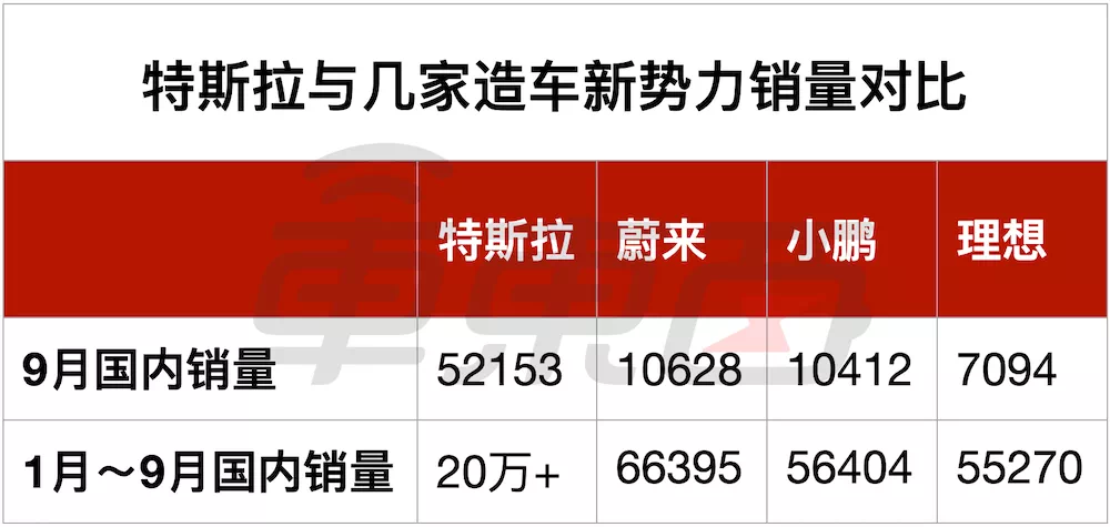 跟中国的“蔚小理”相比,国内月销5万多的特斯拉,远超蔚来、小鹏、理想三家总和。拿国内1—9月份销售来看,特斯拉20万多的销量将三家总销量17万多的数据甩在后面。