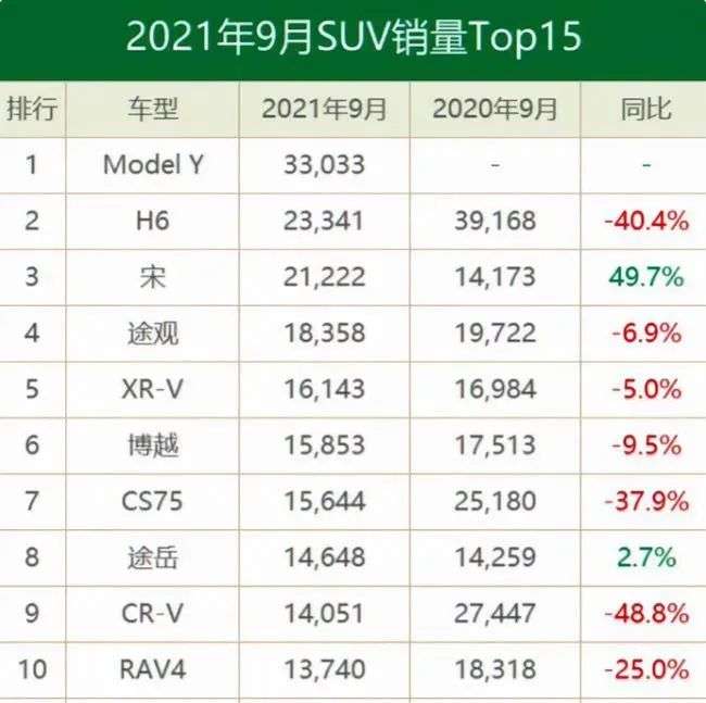 特斯拉Model Y“空降”9月SUV销量榜首 哈弗H6痛失百月冠军 来源:中新汽车