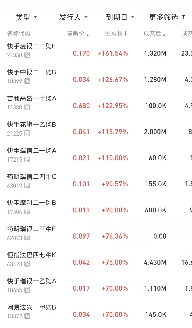 涨幅居前的包括:快手麦银二二购E $21338.HK 涨161.54%,吉利高盛一十购A $11380.HK 涨122.95%,药明瑞信二四牛C $63019.HK 涨90.57%。