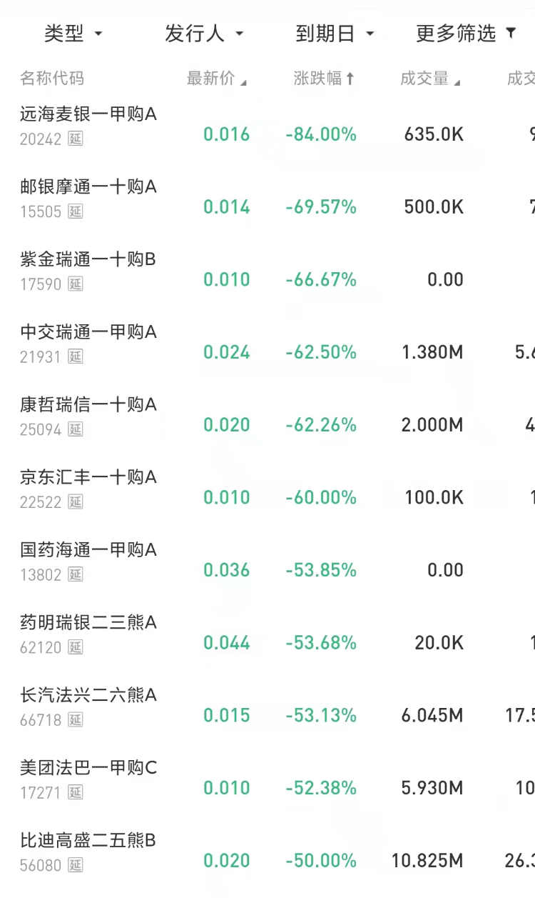 在今日跌幅榜中,远海麦银一甲购A $20242.HK 跌84.00%,邮银魔通一十购A $15505.HK 跌65.52%。