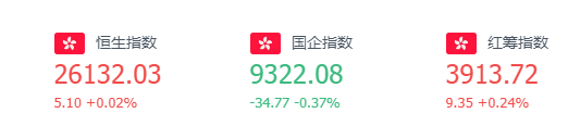 截至周一收盘,恒生指数涨5.1点或0.02%,报26132.03点,国企指数跌0.37%,报9322.08点,红筹指数涨0.24%,报3913.72点。