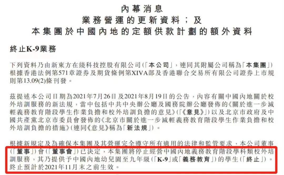 10月25日,新东方宣布将停止经营中国内地义务教育阶段学科类校外培训服务。其乃提供予中国内地幼儿园至九年级(K-9或义务教育)的学生。终止预计于2021年11月末之前生效。
