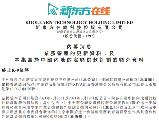新东方在线发布公告,根据新规定及为确保本集团及其营运完全遵守所有适用的法律和监管要求,本公司董事会已决定,本集团将停止经营中国内地义务教育阶段学科类校外培训服务,其乃提供予中国内地幼儿园至九年级(K-9或义务教育)的学生。终止预计于2021年11月末之前生效。