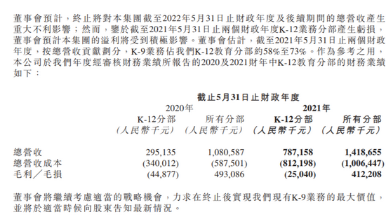 董事会认为,终止将对本集团截至2022年5月31日止财政年度及后续期间的总营收产生 重大不利影响;然而,鉴于截至2021年5月31日止两个财政年度K-12业务分部产生亏损, 董事会预计本集团的溢利将受到积极影响。董事会估计,截至2021年5月31日止两个财政年度,按总营收贡献划分,K-9业务占我们K-12教育分部约58%至73%。