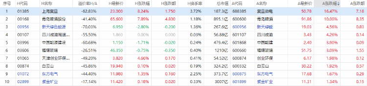 截至发稿,上海复旦A股涨16.47%,H股涨8.24%;青岛啤酒A股涨停,H股涨7.89%;东方电气A股涨1.67%,H股涨1.35%。