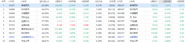 泰格医药A股跌7.26%,H股跌2.76%;时代电气A股跌5.53%,H股跌4.72%;万科企业A股跌4.23%,H股跌5.36%。