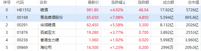 今日港股啤酒板块逆市大涨,截至26日收盘,青岛啤酒股份涨7.98%,华润啤酒涨5.58%,百威亚太涨3.77%。