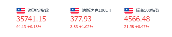 截至周一收盘,道指涨64.13点或0.18%,报35741.15点;纳指涨136.51点或0.90%,报15226.71点;标普500指数涨21.58点或0.47%,报4566.48点,道指、标普再次突破历史新高。