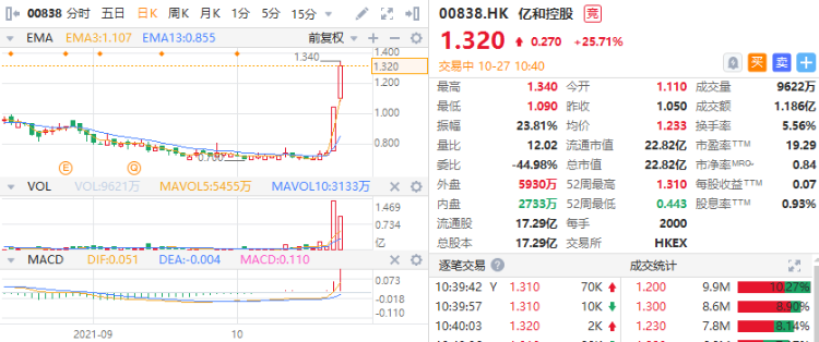 华盛资讯10月27日消息,作为特斯拉概念股之一,亿和控股盘中升势显著,截至发稿,亿和控股涨25.71%,报1.32港元,成交额1.186亿港元。