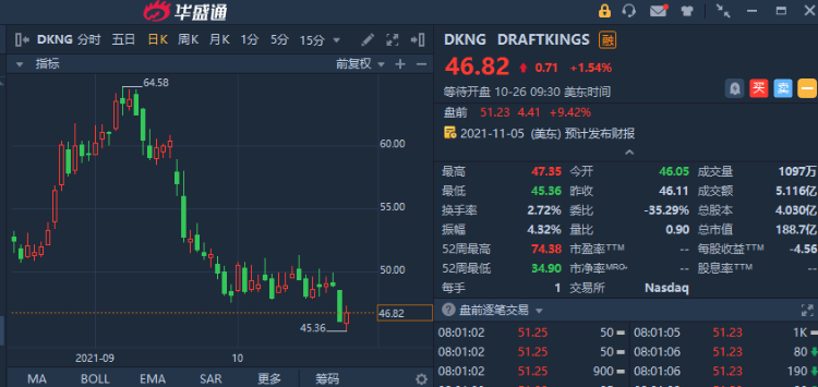 10月26日,DraftKings盘前快速拉涨超9%,市场消息:DraftKings确认它不会向英国体育博彩公司Entain发出收购要约。