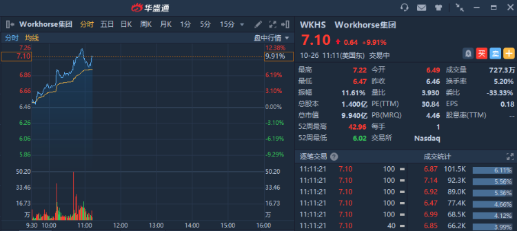 华盛资讯10月26日讯,美股盘中,Workhorse(WKHS)涨近10%,Lordstown Motors(RIDE)涨超5%,Nikola(NKLA)、图森未来(TSP)涨超3%,特斯拉(TSLA)、Fisker(FSR)涨超2%。