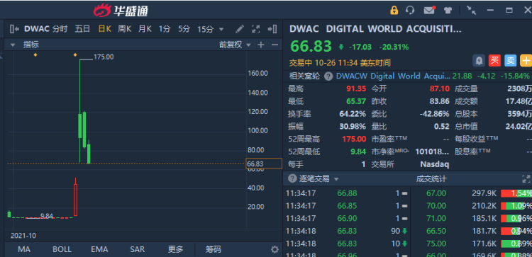 特朗普概念股Digital World Acquisition Corp(DWAC)周一美股收盘跌10.98%,报83.86美元。据悉,做空机构Iceberg Research称正在做空该股。