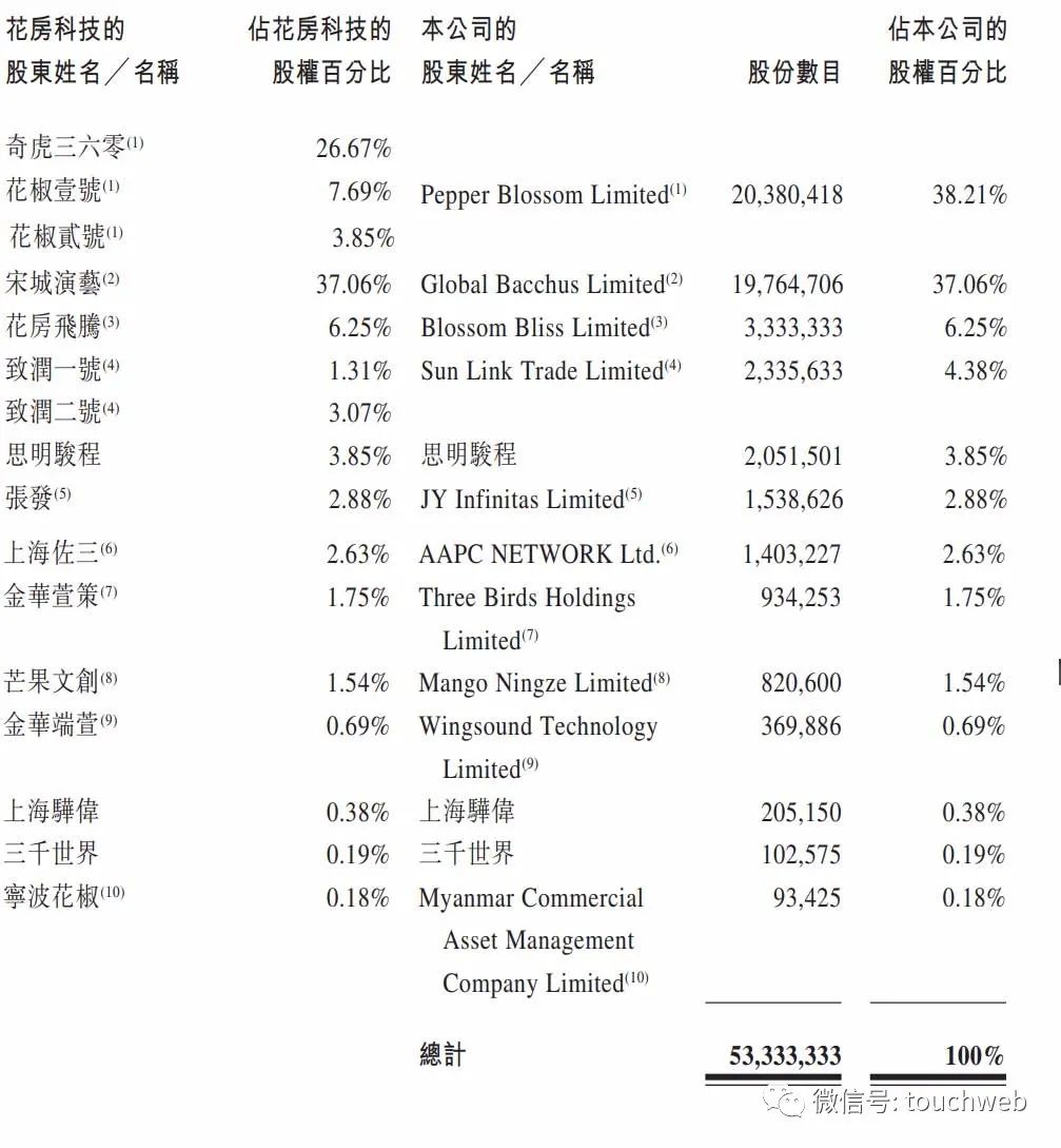 IPO前,奇虎三六零持有花房科技26.67%股权,花椒壹号持有7.69%股权,花椒贰号持股3.85%,即通过Pepper Blossom Limited持有38.21%股权。