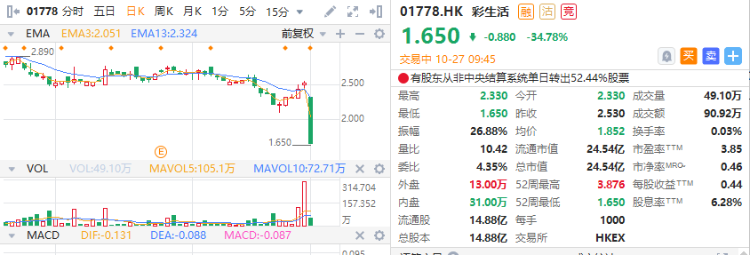华盛资讯10月27日消息,彩生活复牌大跌超34.78%,报1.65港元,核心资产邻里乐已转让给碧桂园服务。