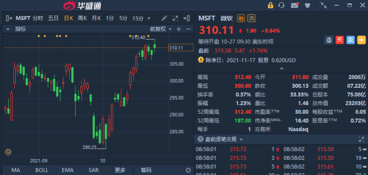 Q1各项财务报表均交出满意的答卷,微软股价在美股盘前涨幅近2%,报315.58美元,再度刷新股价高点。