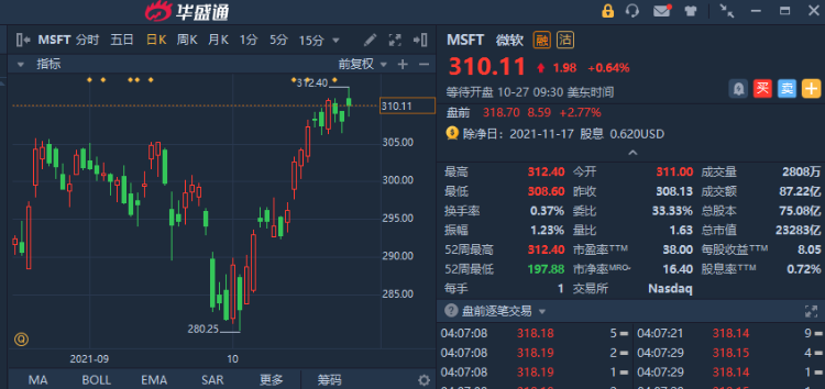 微软(MSFT)盘前涨2.77%,第一财季净利润205亿美元,同比增长48%。