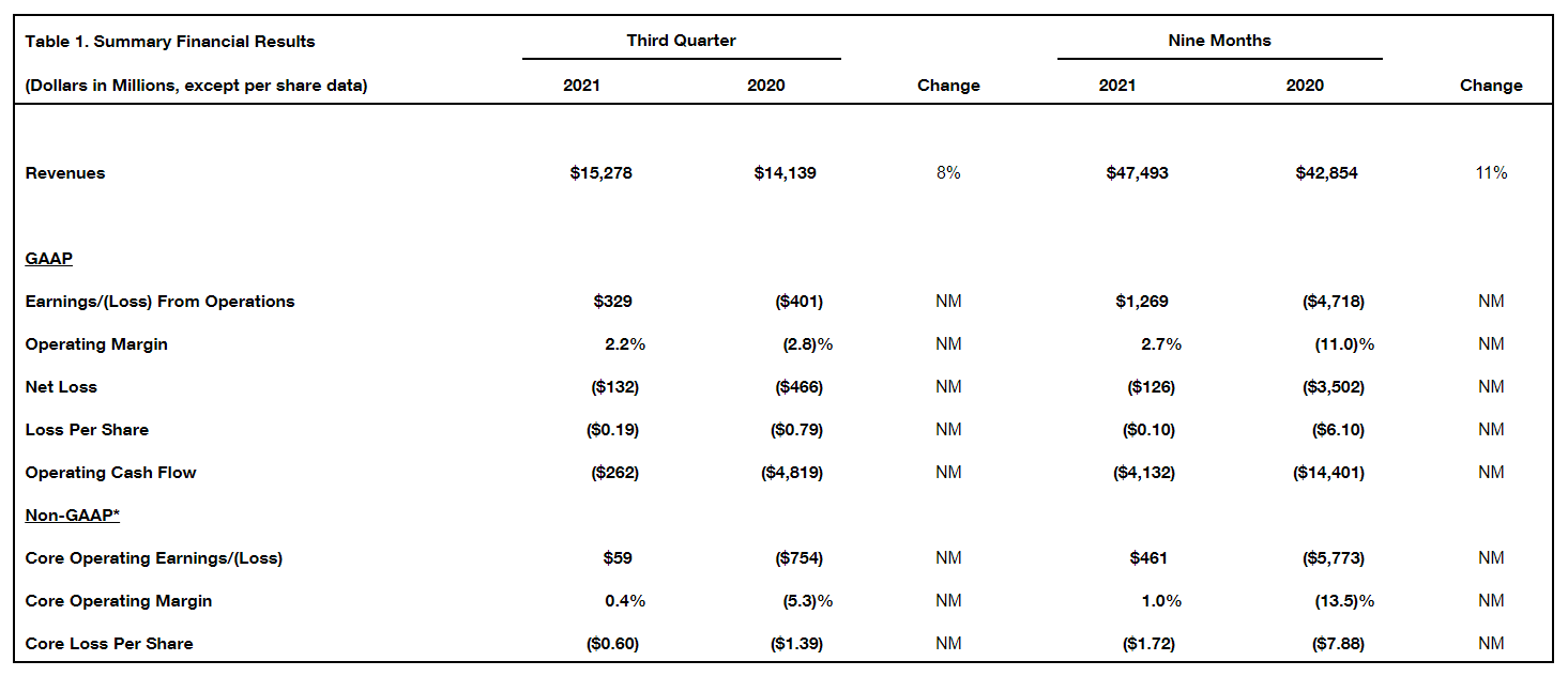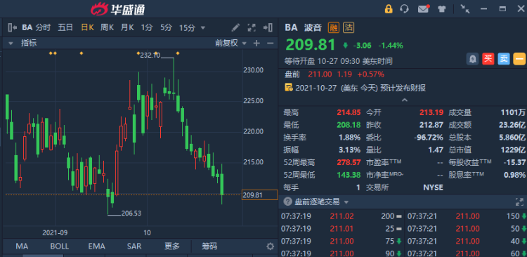 10月27日,波音 $BA 发布2021年第三季度业绩。财报显示,第三季度营收153亿美元,市场预期164.77亿美元,去年同期141.39亿美元;净亏损1.32亿美元,市场预期净利润2.65亿美元,去年同期净亏损4.49亿美元;每股亏损0.19美元,市场预期盈利0.45美元,去年同期亏损0.79美元。