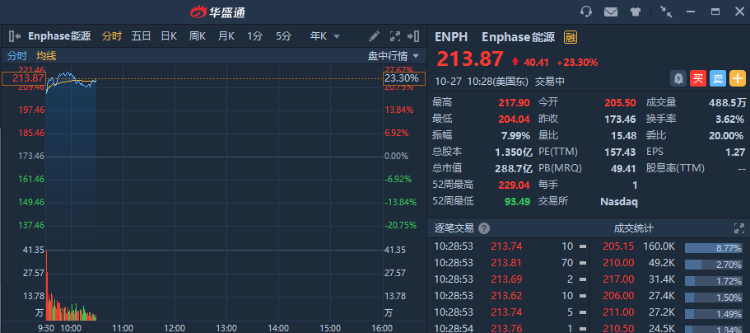 华盛资讯10月27日讯,美股盘中,光伏板块大涨,Enphase能源(ENPH)涨超23%,SolarEdge(SEDG)涨超10%,瑞能新能源(SOL)涨超9%,美国太阳能(SPWR)、晶科能源(JKS)涨近9%。