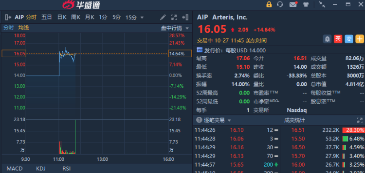 半导体科技公司Arteris(AIP)首日登陆纳斯达克交易所,现报16.05美元,IPO价为14美元,现涨14.64%。