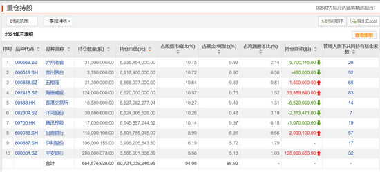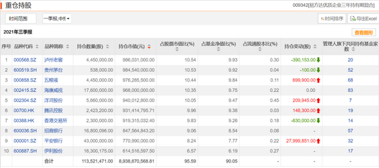 前十大重仓股分别为泸州老窖、贵州茅台、五粮液、海康威视、洋河股份、腾讯控股、香港交易所、招商银行、平安银行和伊利股份,“眼茅”爱尔眼科、港股美团-W则已退出。