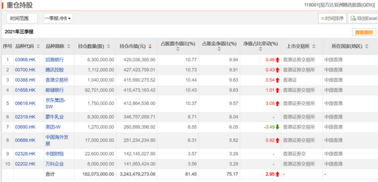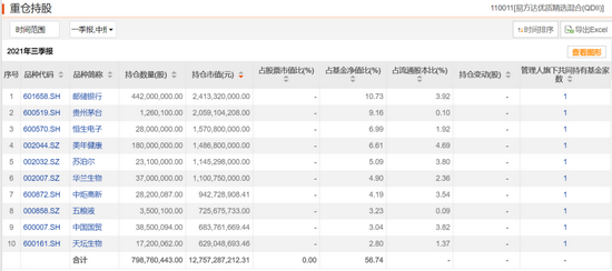 其中,邮储银行取代通策医疗跃升为第一大重仓股,持股数量4.42亿股,持股市值占基金净值比10.73%,中国国贸新进为第八大重仓股,百润股份则已不在前十大行列。全面来看,前十大重仓股分别为邮储银行、贵州茅台、恒生电子、美年健康、苏泊尔、华兰生物、中炬高新、五粮液、中国国贸、天坛生物。