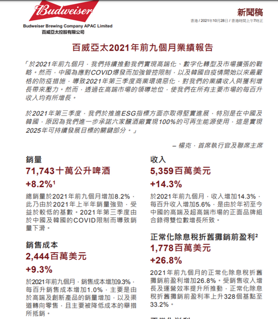 2021年前九个月啤酒销量71.74亿公升,同比增长8.2%,此乃由于2021年上半年销量强劲,受益于较低的基数。