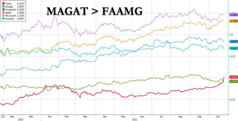 一年前美股经典组合是FAAMG(脸书、苹果、亚马逊、微软、谷歌),一年后特斯拉强势进攻,Facebook节节败退,组合变成了MAGAT。不过脸书也不甘落后,主业经营下滑后,全面开拓下一个闪光点:元宇宙。