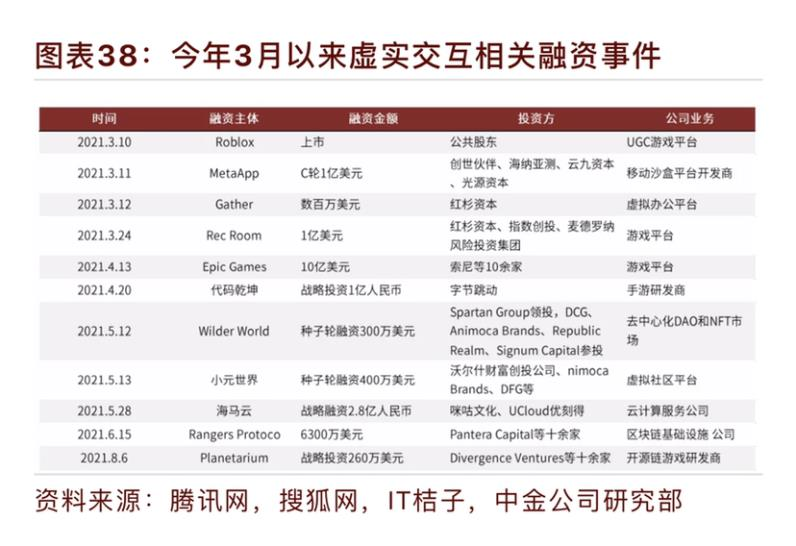 不仅仅是FB专注元宇宙概念,事实上自Roblox上市后,虚实交互概念多项目斩获大额投资。其中2021年4月13日,游戏平台Epic Games融资金额达10亿美元,是截至目前虚实交互赛道最大规模的融资交易;4月下旬,国内手游研发商代码乾坤获得字节跳动约1亿人民币的战略投资。