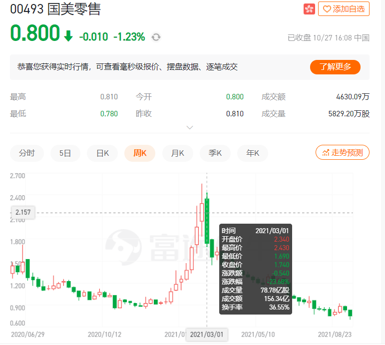 10月27日,国美零售股价最低时仅0.780港元,相比今年最高价缩水了三倍,后又回升0.800港元之上。不到三百天的时间,这一涨一落间,究竟发生了什么?