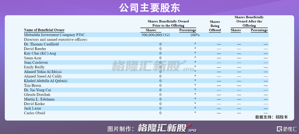 格芯 IPO前夕,阿布扎比国有基金穆巴达拉(Mubadala)投资公司通过其子公司MTIC和MTIIIC持有公司5亿股普通股,为格罗方德(即“格芯”)全部股本的唯一股东。同时,穆巴达拉也是公司最终的母公司。