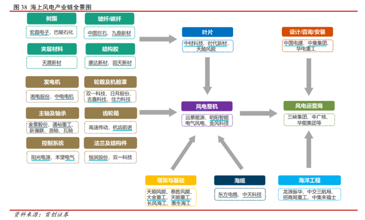 海上风电产业链结构大致可分为上游的原材料生产与零部件制造,中游的整机与相关海缆建设以及下游的风电运营商电网运营等环节构成等三个环节。