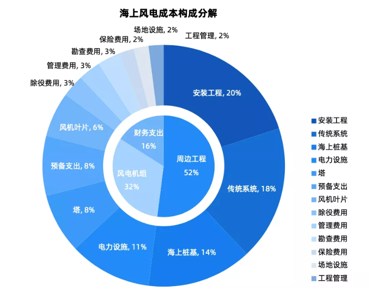 难点还在于风险高、高度高、精度高(毫米级别),因此建设成本是陆上风电场的2-3倍。