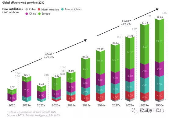 GWEC市场战略主管表示:“在英国、中国和德国的引领下,过去10年,我们看到海上风电出现了前所未有的增长。展望未来30年,亚洲将占全球市场的40%,其次欧洲(32%)、北美(18%)。”