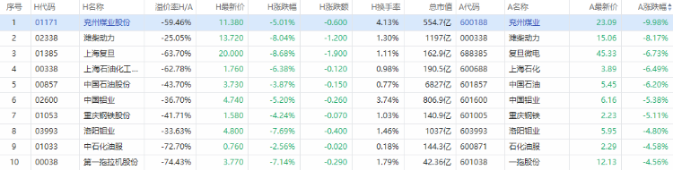 兖州煤业A股跌停,H股跌5.01%;上海复旦A股跌6.73%,H股跌8.68%;中国铝业A股跌5.38%,H股跌5.2%。