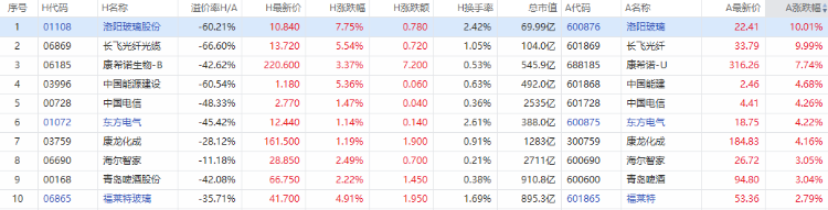 截至发稿,洛阳玻璃A股涨停,H股涨7.75%;康希诺生物A股涨7.74%,H股涨3.37%;东方电气A股涨4.22%,H股涨1.14%。