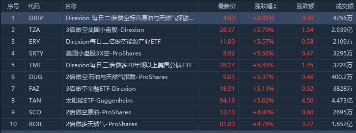从ETF涨幅榜来看,每日二倍做空标普原油与天然气ETF $DRIP 涨8.85%,成交额4255万港元。每日二倍做空能源产业ETF $ERY 涨5.57%,成交额2109万美元。