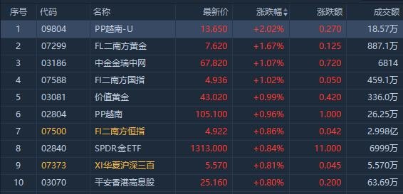 今日港股市场涨幅居前的南方两倍看多黄金ETF $07299.HK 1.67%,成交额887.1万港元;南方两倍看空国指ETF $07588.HK 涨1.02%,成交额459.1万港元。