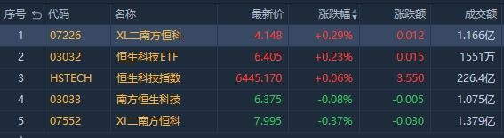 南方两倍做多恒科 $07226.HK 涨0.29%,成交额为1.166亿港元;