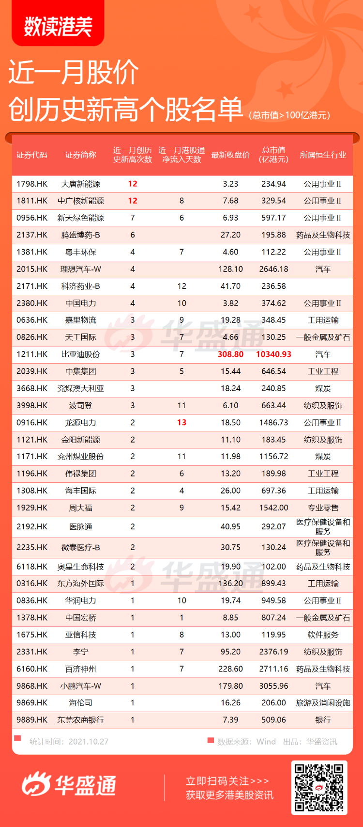进入十月,恒生指数震荡走高,煤炭、电力、汽车板块轮动表现也带动着一些个股股价屡创新高。创新高的能力是衡量股价强弱的指标之一,發仔整理了近一个月股价创历史新高的个股名单,一起来看看吧!