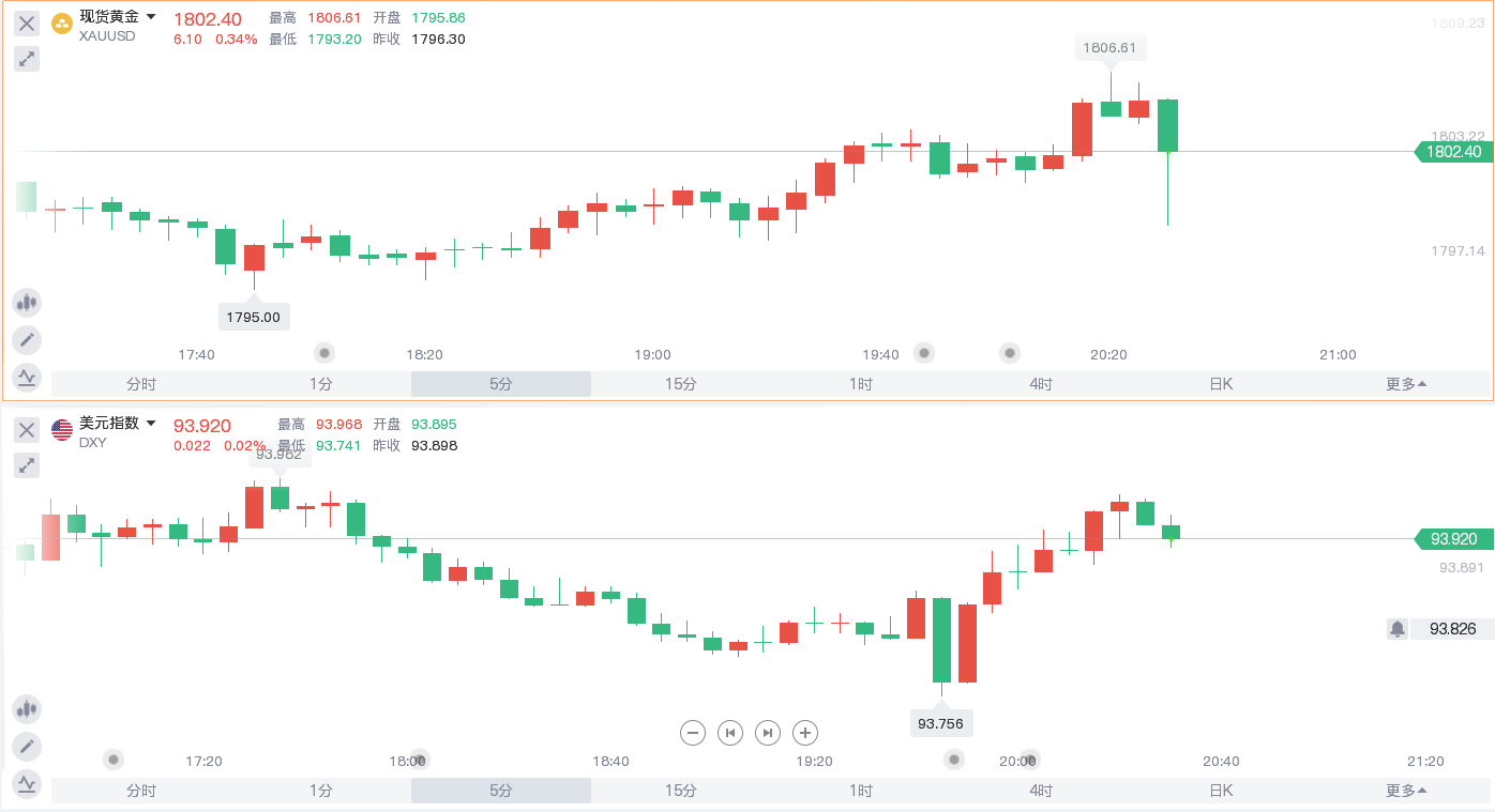 数据公布后,现货黄金短线下挫约4美元,日内涨幅维持在0.34%,报1802.4美元/盎司,现货白银短线下挫0.1美元,报24.06美元/盎司,美元指数报93.92。COMEX最活跃黄金期货合约北京时间10月28日20:30一分钟内买卖盘面瞬间成交3942手,交易合约总价值7.11亿美元。