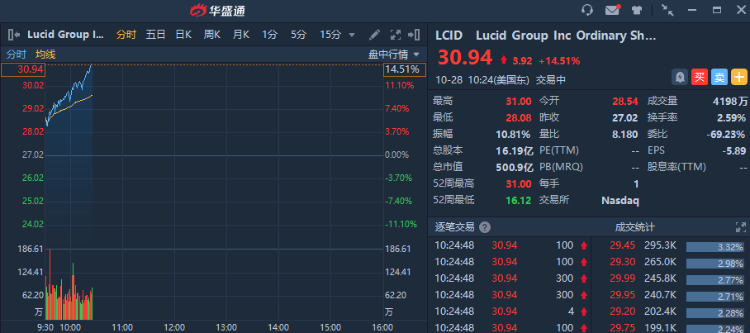 华盛资讯10月28日讯,美股盘中,新能源汽车板块走强。截至发稿,Lucid(LCID)涨超14%,福特(F)涨超9%,法拉第未来(FFIE)涨超6%、Workhorse(WKHS)涨近5%,图森未来(TSP)涨近4%,特斯拉(TSLA)涨超2%,理想汽车(LI)涨超1%。