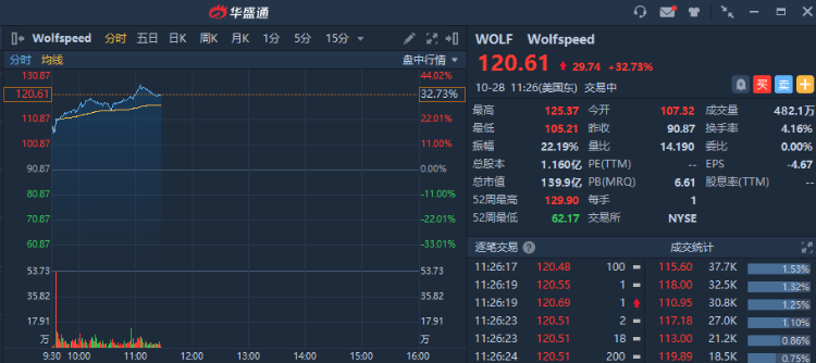 华盛资讯10月28日讯,美股盘中,半导体板块普涨。截至发稿,Wolfspeed(WOLF)涨近33%,Maxlinear(MXL)涨超16%,意法半导体(STM)涨超7%,安森美半导体(ON)涨超5%,日月光(ASX)、微芯科技(MCHP)、恩智浦(NXPI)涨超3%。