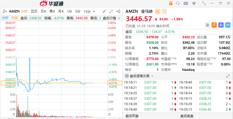 同时,美东时间10月28日盘后,亚马逊三季度主要业绩及四季度指引均低于市场预期,股价盘后一度跌超4%。