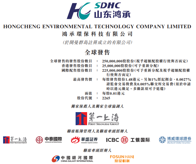 鸿承环保科技今日起至下周三(11月3日)招股,拟发行2.5亿股股份,入场费7474.57港元,预期11月11日上市。