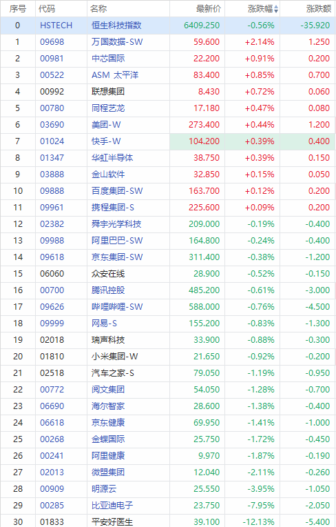 万国数据涨超2%,中芯国际、ASM太平洋、联想集团等涨近1%。平安好医生续挫12.13%,本周累计大跌28%,比亚迪电子狂泻近8%,明源云跌近4%,微盟集团跌超2%。