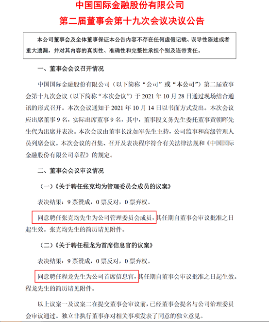 中金公司发布的《第二届董事会第十九次会议决议公告》,其中涉及两则重要的人事聘任,即同意聘任张克均先生为公司管理委员会成员,同意聘任程龙先生为公司首席信息官。